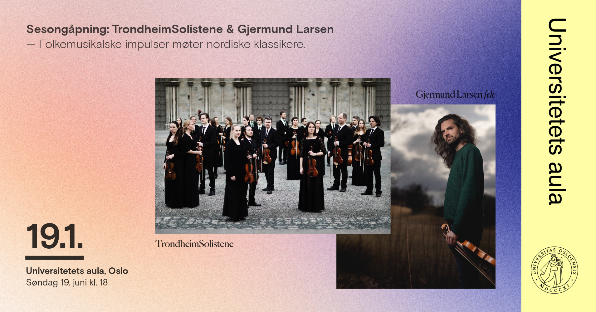 For a number of years, the TrondheimSolistene and Gjermund Larsen have had a musical collaboration that has garnered praise and recognition both nationally and internationally. The interaction at the intersection of folk and classical music has resulted in dozens of concerts and several album releases, but it has been many years since the "duo" played in Oslo. Now they are ready for Aulaseriene ! The Trondheim Soloists also bring a selection of folk music-inspired works from Finland, the USA and Norway, carefully selected for this concert.